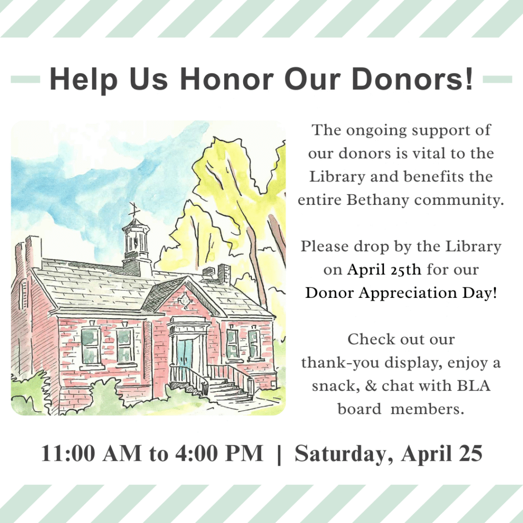 The ongoing support of our donors is vital to the Library and benefit the entire Bethany community. Please drop by the Library any time between 11:00 AM – 4:00 PM on April 25 for our Donor Appreciation Day! Check out our thank-you display, enjoy a snack, and chat with BLA board members – be part of all the Library has to offer.