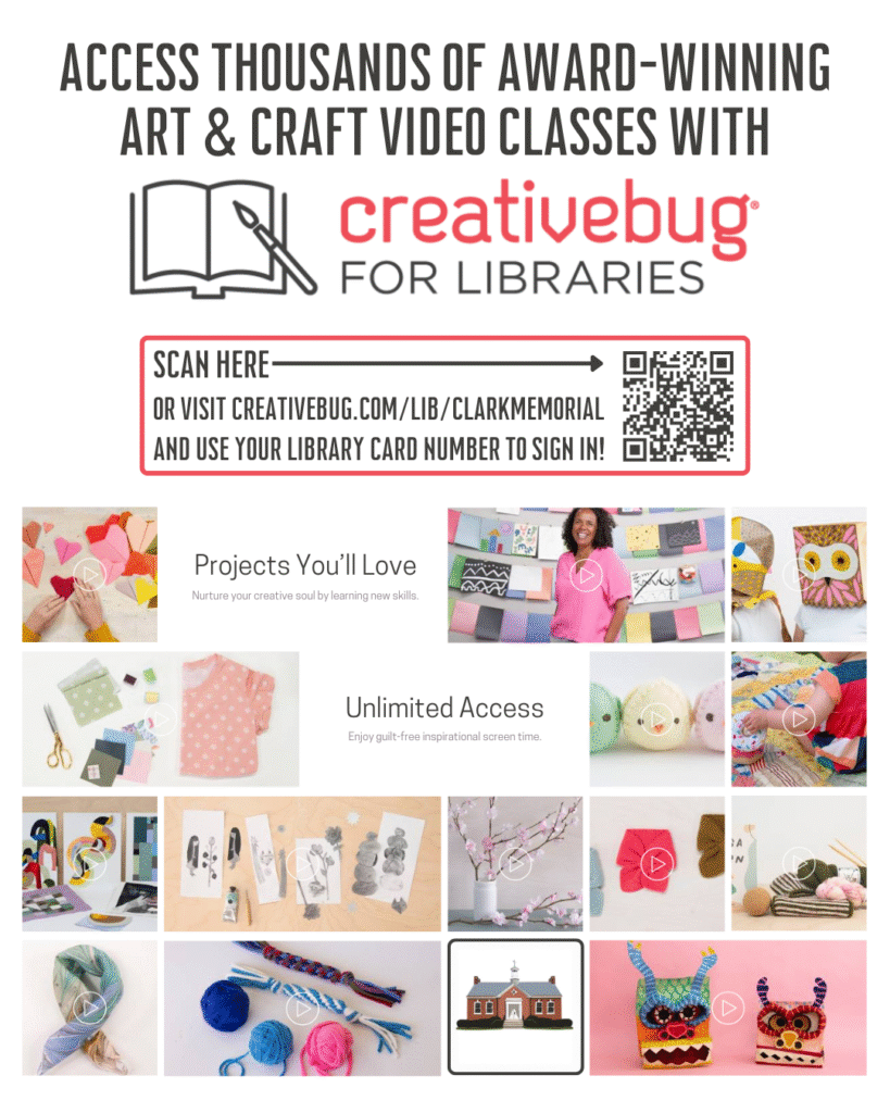 Did you know that you can access thousands of award-winning art and craft video classes through CreativeBug with just your library card? Visit creativebug.com/lib/clarkmemorial and use your library card number to sign in for free. You’ll have unlimited access to countless projects you’ll love – it’s a great way to learn new skills and find fun ways to apply the ones you already enjoy!